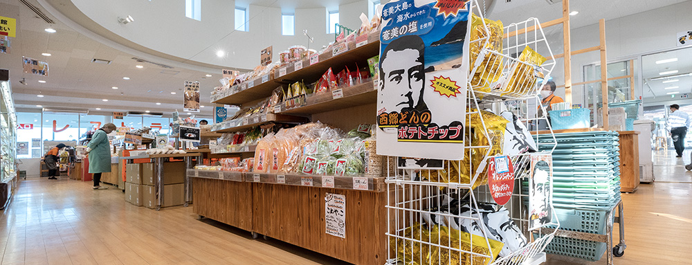 道の駅たるみず湯っ足り館の売店では、垂水エリアで取れる地元の特産品(ぶり大将・桜勘などの水産品から、生産量日本一のいんげんを使用したスープなどの農産品、人気の温泉水、名産の焼酎)を始め、鹿児島県下各地の特産品を使った様々な魅力的な商品をお買い求めいただけます。